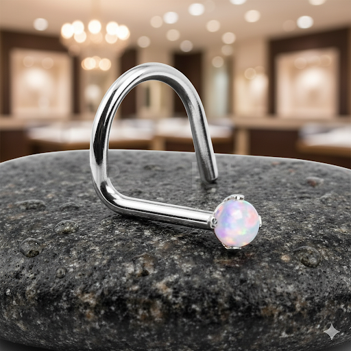 Luxurious and elegant nose screw featuring authentic 14kt white gold construction paired with iridescent natural opalite stone for stunning nose decoration. This classy piece combines polished white gold sophistication with the ethereal beauty of opalite’s color-shifting properties, creating mesmerizing light play and celestial appeal. The secure prong setting showcases the natural opalite while the screw design ensures comfortable retention with premium precious metal quality and mystical gemstone allure.