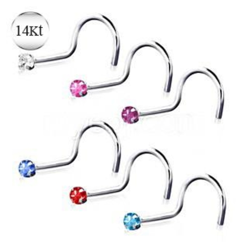 Premium 14kt white gold nose ring featuring a high-quality prong-set cubic zirconia stone that adds elegant sophistication to your nostril piercing. This authentic solid white gold piece showcases a secure four-prong setting that maximizes stone brilliance while ensuring long-term retention. The 2mm CZ stone provides the perfect balance of sparkle and subtlety, while the screw mechanism offers reliable comfort and security for daily wear with luxury metal quality.