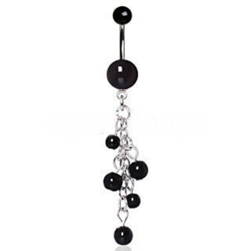 Funky yet understated belly ring that elevates the classic UV acrylic navel ring style with sophisticated beaded chain cascade for dramatic navel draping. This piece begins with glossy black UV acrylic balls and transforms into metallic chain adorned with black beads for glamorous chandelier effect. The ostentatious design maintains subtlety through monochrome color scheme while the cascading beads create movement and visual interest, crafted from 316L surgical steel and UV acrylic for durability and style.