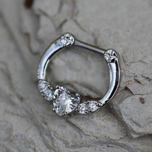 Romantic septum clicker featuring a stunning 6mm faceted heart-shaped cubic zirconia centerpiece surrounded by delicate press-fit CZ leaf accents. This flirtatious 316L surgical steel piece combines sparkly allure with polished silver metal, creating centered design elegance that highlights the natural beauty of your septum piercing. The comfortable clicker mechanism provides secure closure while the heart and leaf motif adds feminine charm with brilliant crystal sparkle.