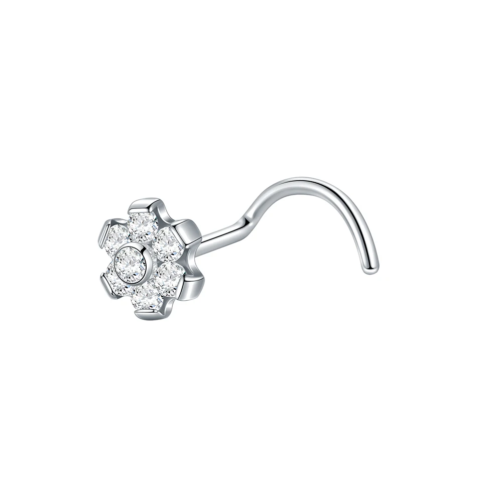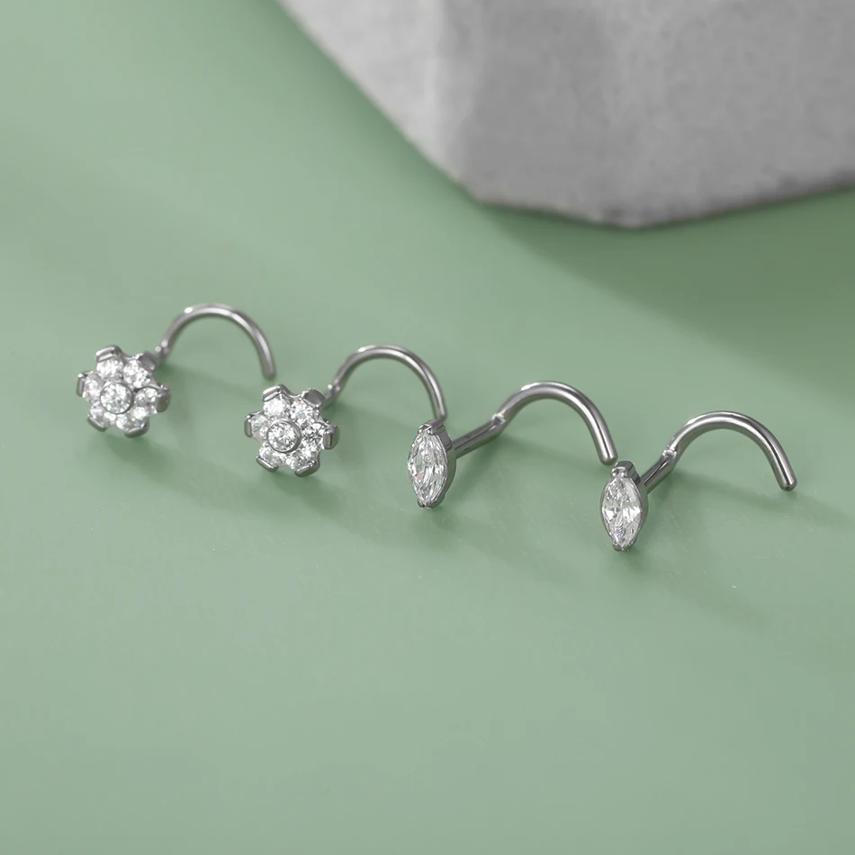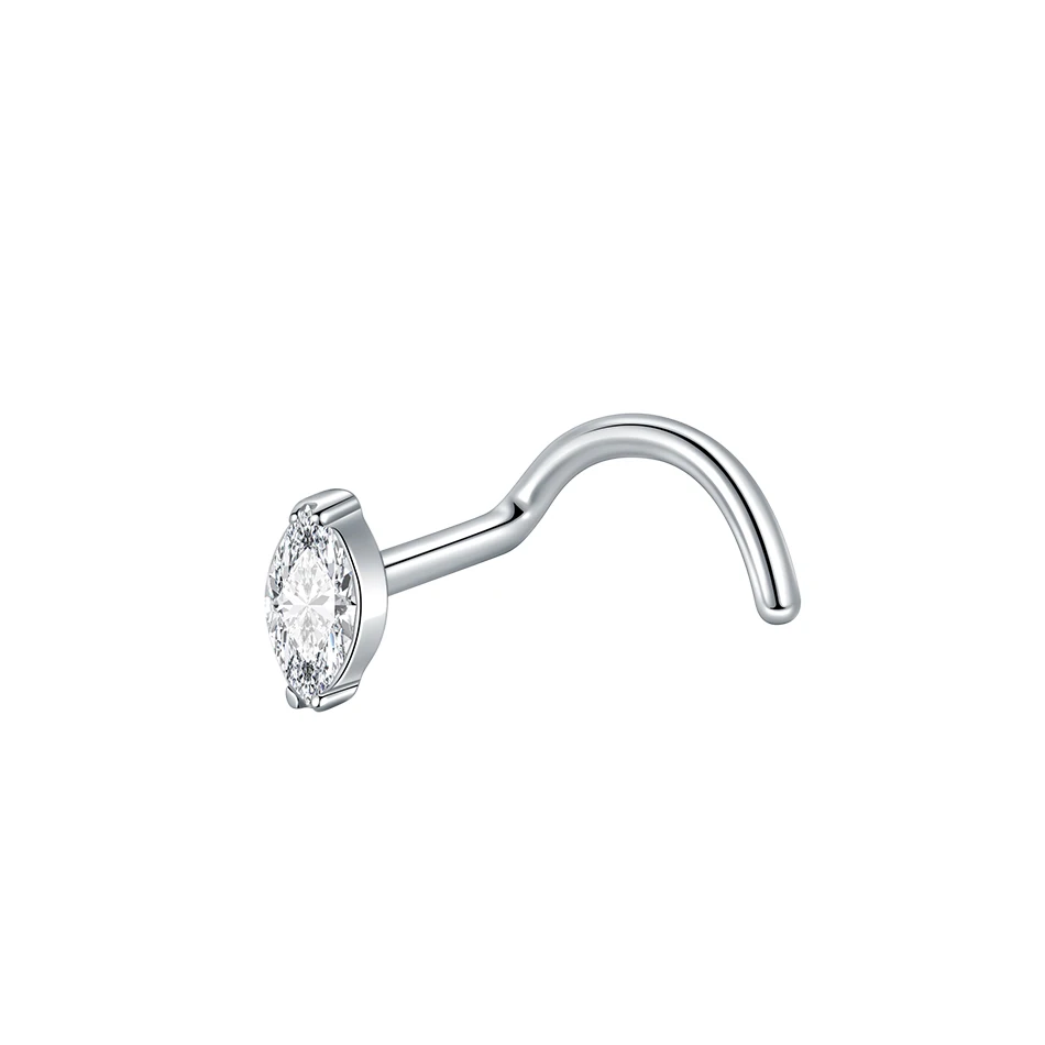 Premium implant grade titanium nose screw featuring marquise cubic zirconia crystal accent for cute and romantic nostril piercing elegance with sophisticated sparkle. This fashion-forward piece combines medical-grade titanium construction with brilliant CZ detailing in classic silver coloring for versatile styling. The screw design ensures secure retention and comfortable wear while the precision-crafted threading provides reliable closure with superior biocompatibility and hypoallergenic properties for safe nose piercing applications.