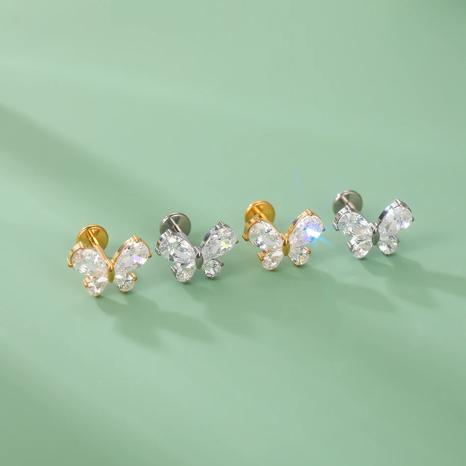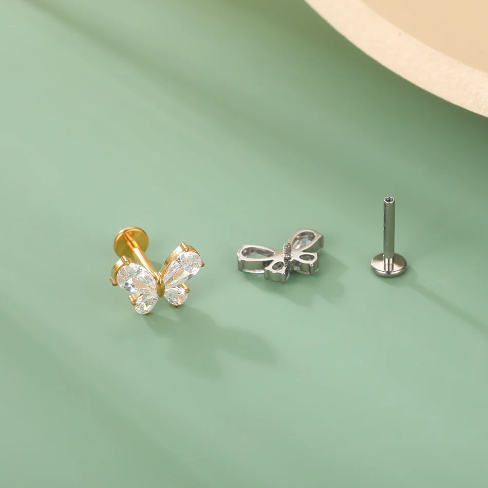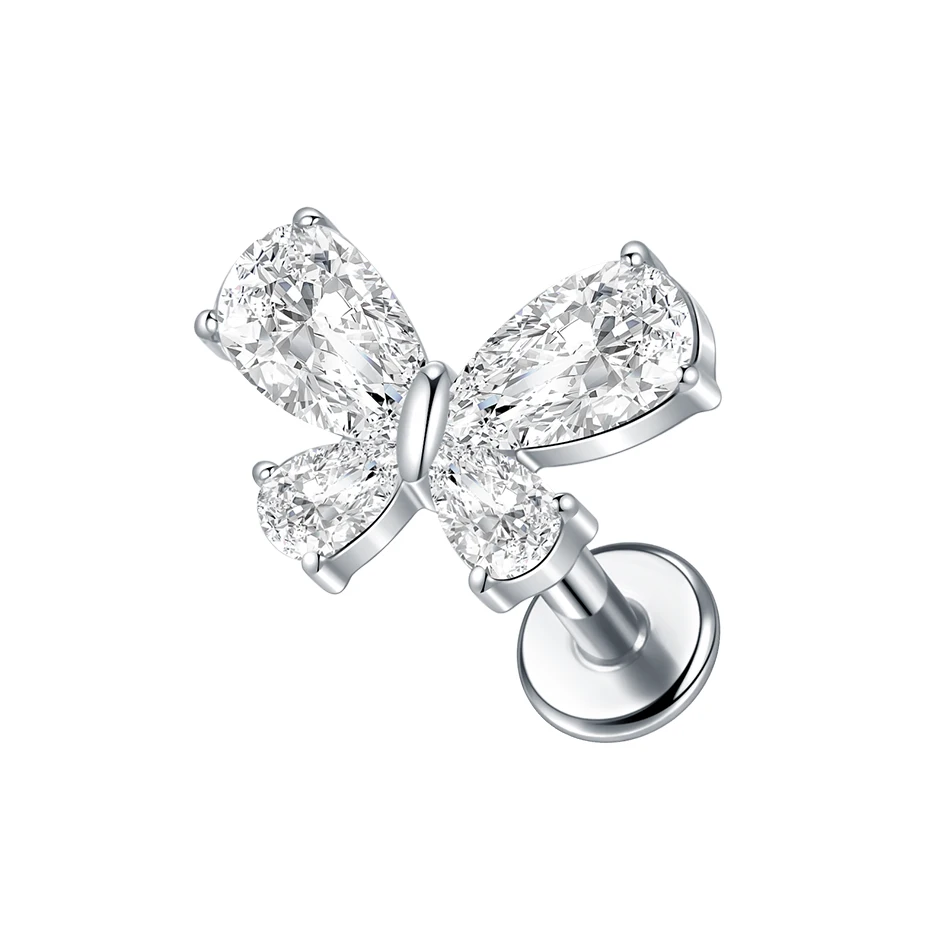 Premium G23 titanium internally threaded labret featuring charming zircon bow design for cute and romantic piercing aesthetics with superior biocompatibility. This fashion-forward piece combines medical-grade titanium construction with sparkling cubic zirconia bow accent available in silver and gold color options. The internally threaded design ensures smooth insertion and comfortable wear while the flat back labret style provides versatile placement across multiple piercing locations with hypoallergenic safety.