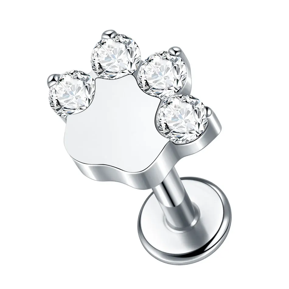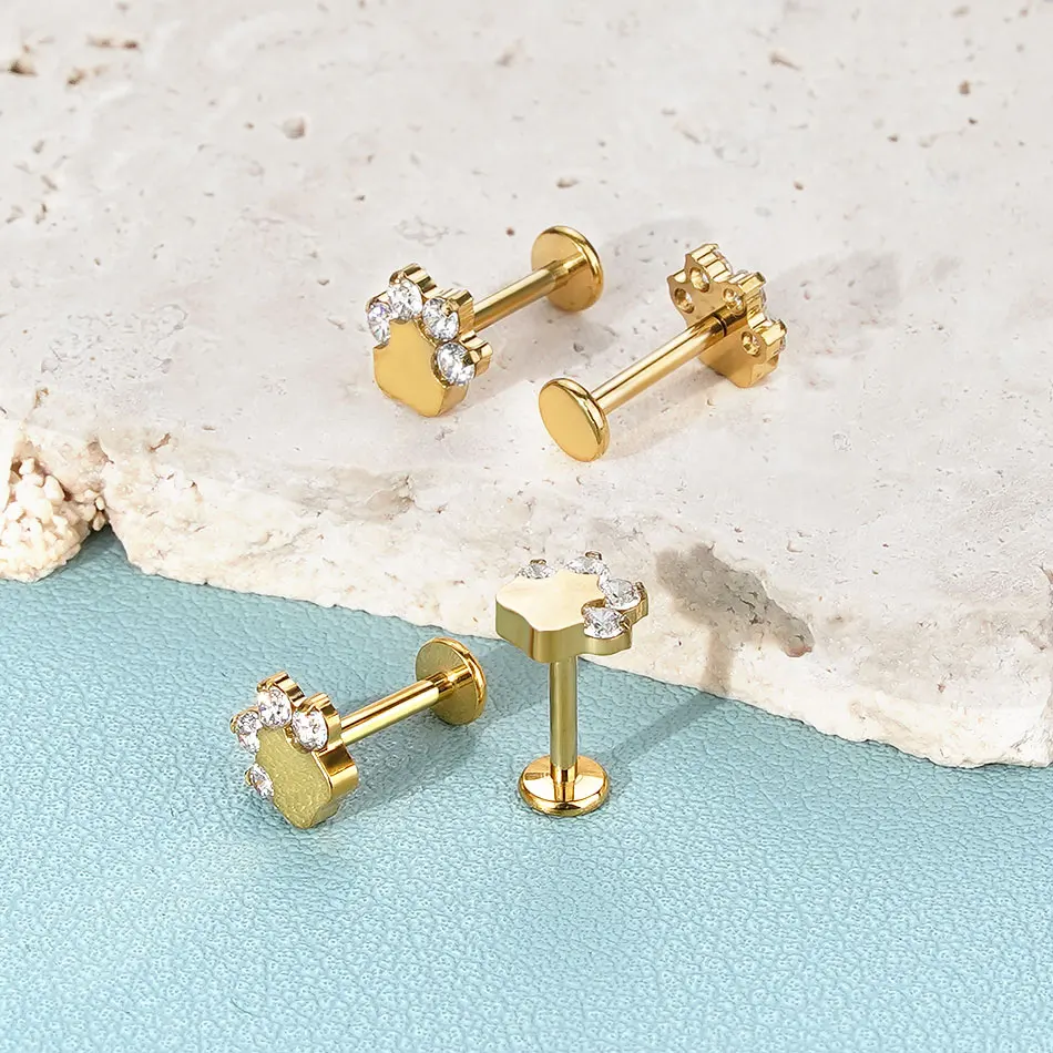 Premium G23 titanium internally threaded labret featuring adorable dog paw print design for pet-loving piercing enthusiasts and animal-themed body jewelry styling. This trendy piece combines medical-grade titanium construction with charming paw print detailing available in silver and gold color options for personalized appeal. The internally threaded design ensures smooth insertion and comfortable wear while the precision-engineered threading provides secure retention across multiple piercing locations with superior biocompatibility and hypoallergenic properties.