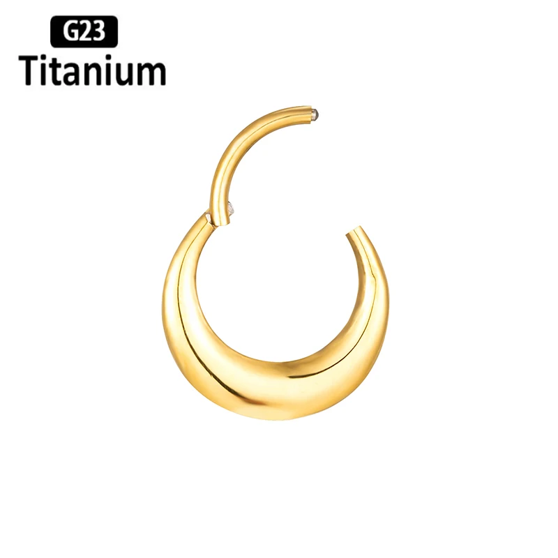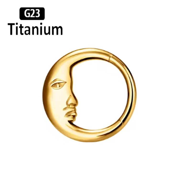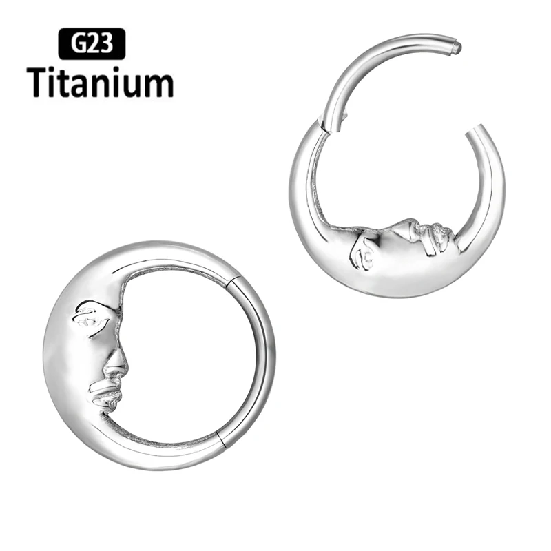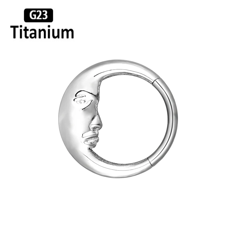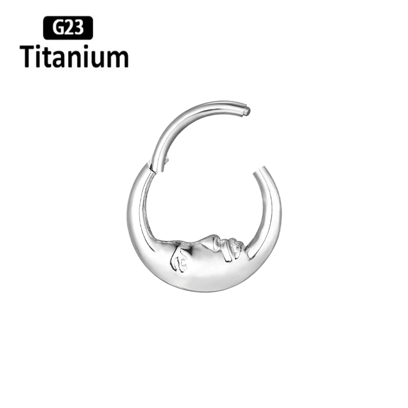 Classic mirror-finished titanium clicker featuring elegant moon and waterdrop design elements for celestial-inspired piercing aesthetics. This ASTM F136 G23 titanium piece combines lunar symbolism with teardrop styling in a versatile segment ring construction. The mirror polish creates reflective brilliance while the clicker mechanism provides secure closure for septum, tragus, cartilage, and daith applications with smooth operation and reliable retention.