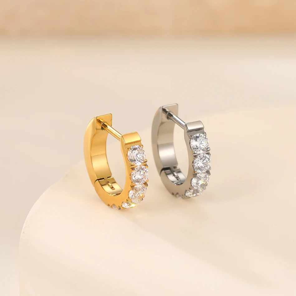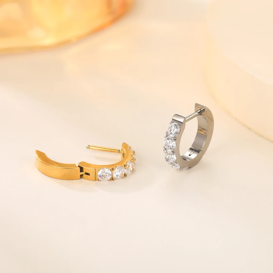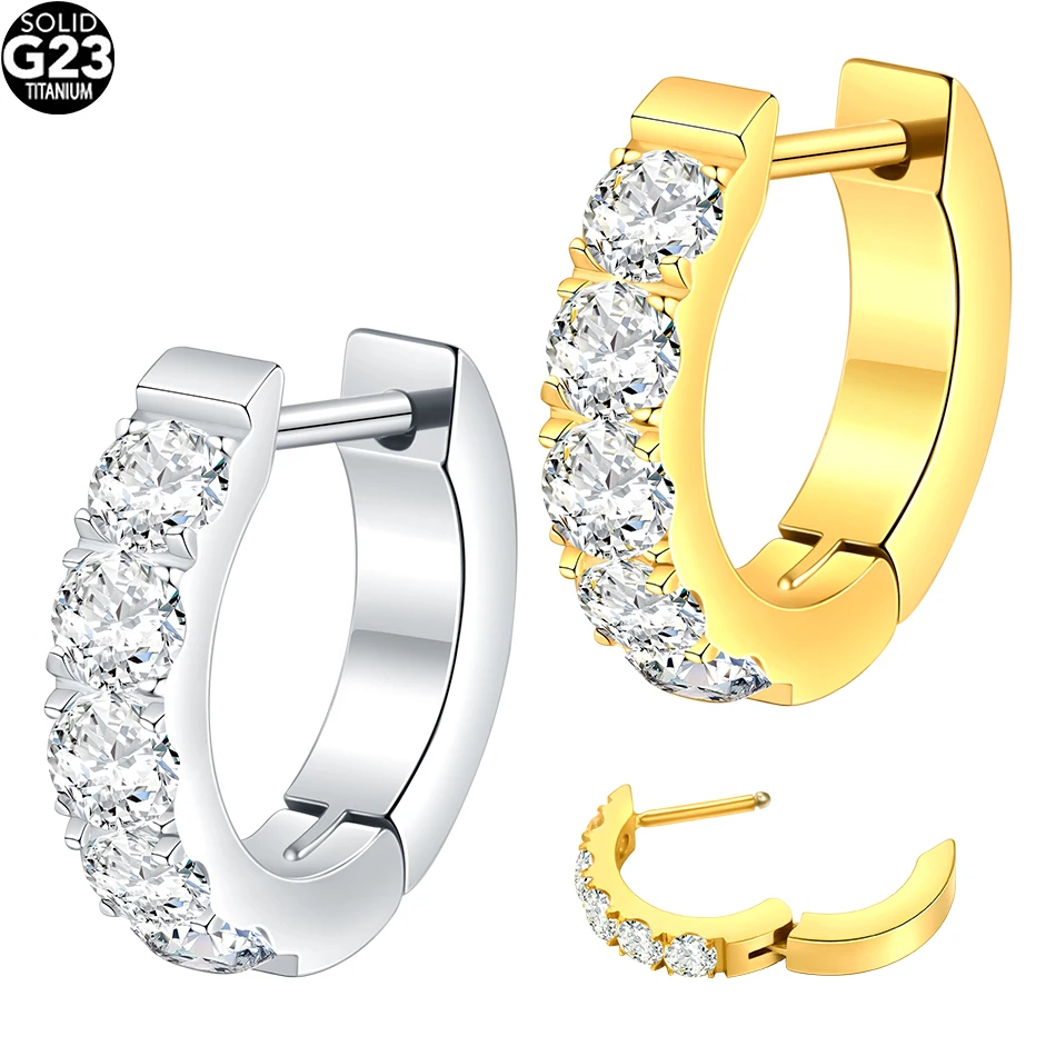 High-quality G23 ASTM F136 titanium huggie hoop earrings featuring exquisite pattern work with white zirconia accents for stylish and charming piercing versatility. These trendy hoops combine medical-grade titanium construction with sparkling zirconia details available in silver and gold color options for personalized appeal. The 10mm diameter provides comfortable fit while the huggie design ensures secure closure across cartilage, tragus, helix, and daith applications with hypoallergenic properties and superior biocompatibility.