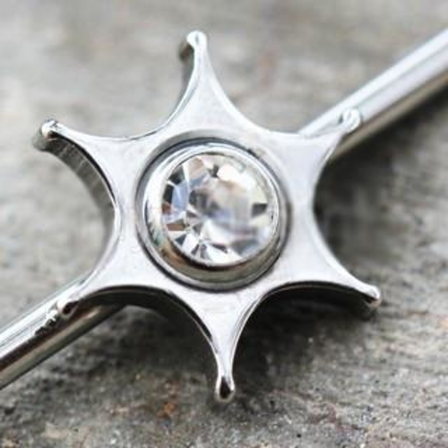 Celestial-inspired industrial barbell featuring a stunning star centerpiece with a brilliant clear cubic zirconia stone at its heart. This premium 316L stainless steel piece captures cosmic elegance with its precisely crafted star design, creating a striking focal point for your industrial piercing. The balanced proportions and quality construction make this an ideal choice for those seeking both style and durability.
